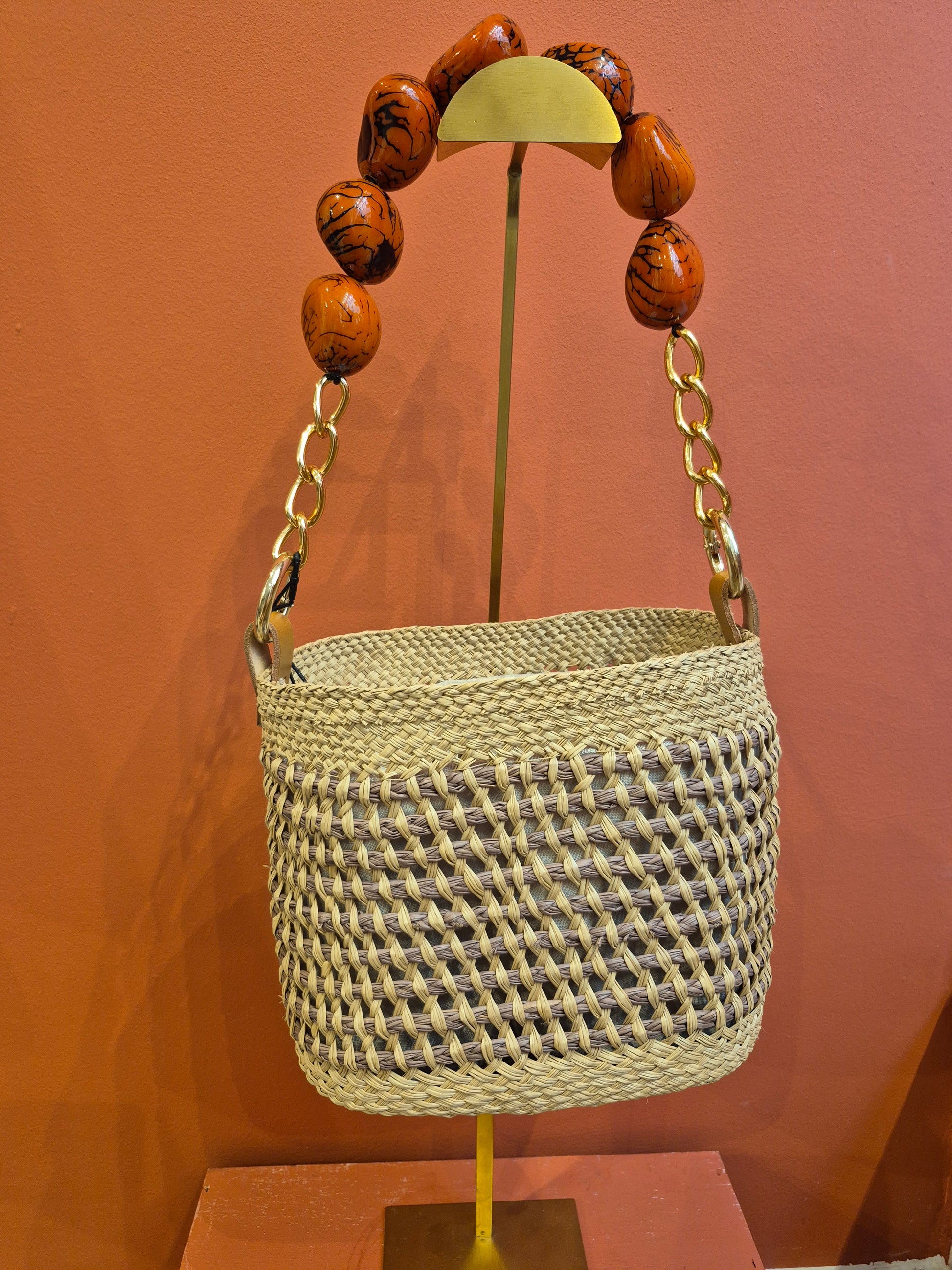Este bolso hecho a mano es una pieza única que combina tradición y estilo mediterráneo. Tejido en fibra natural con tonos amarillos vibrantes, su diseño calado lo hace ligero y perfecto para los días de verano. El asa, adornada con cuentas grandes en morado y amarillo y una cadena dorada, le da un toque original y sofisticado. Ideal para paseos, tardes de cóctel o simplemente para llevar el verano contigo donde vayas.