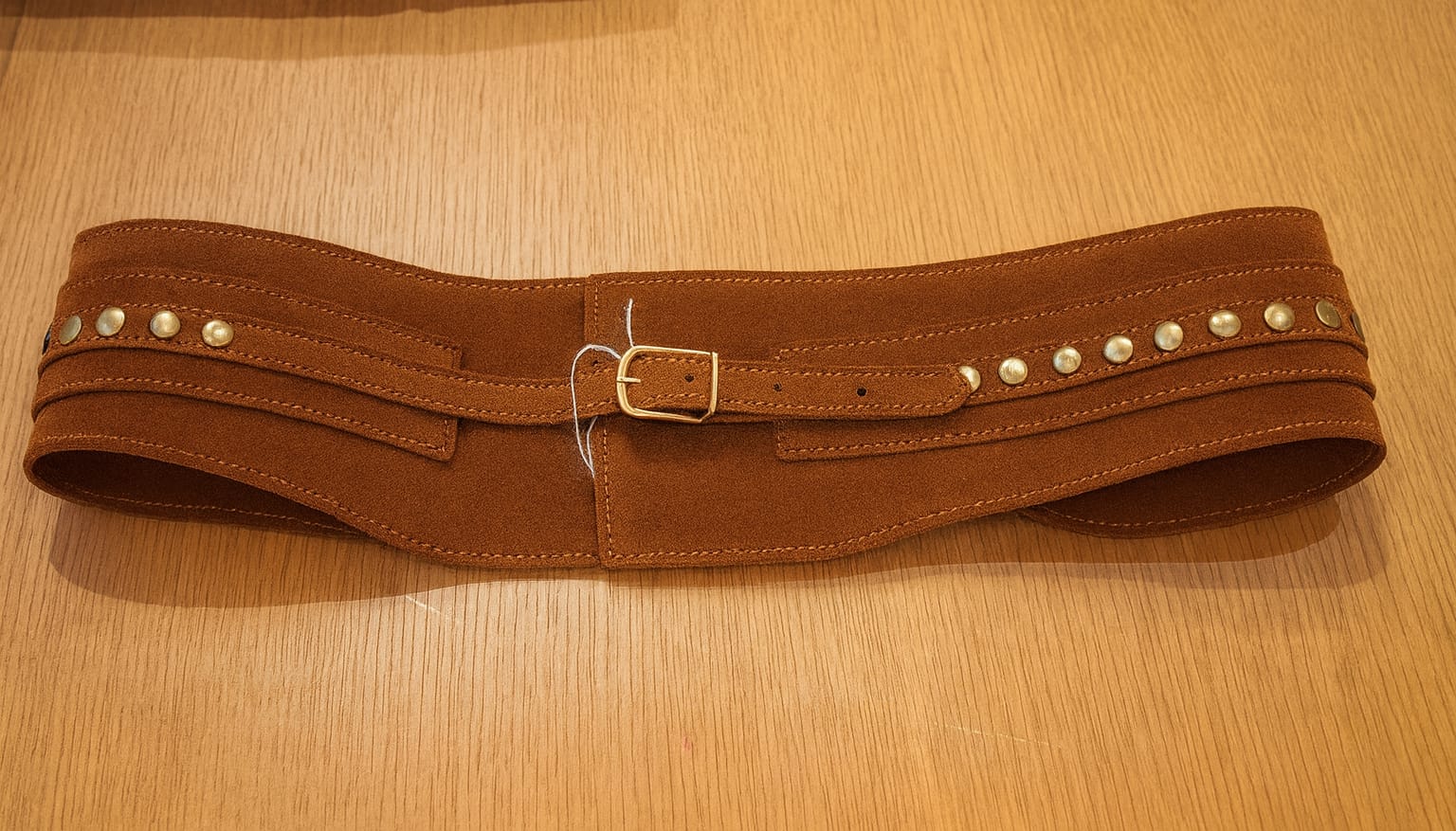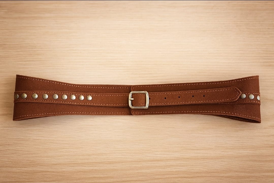 Cinturón de cuero, ancho y de diseño envolvente, con acabado suave y hebilla dorada. Su forma estiliza la cintura y aporta un toque moderno y elegante a cualquier look.