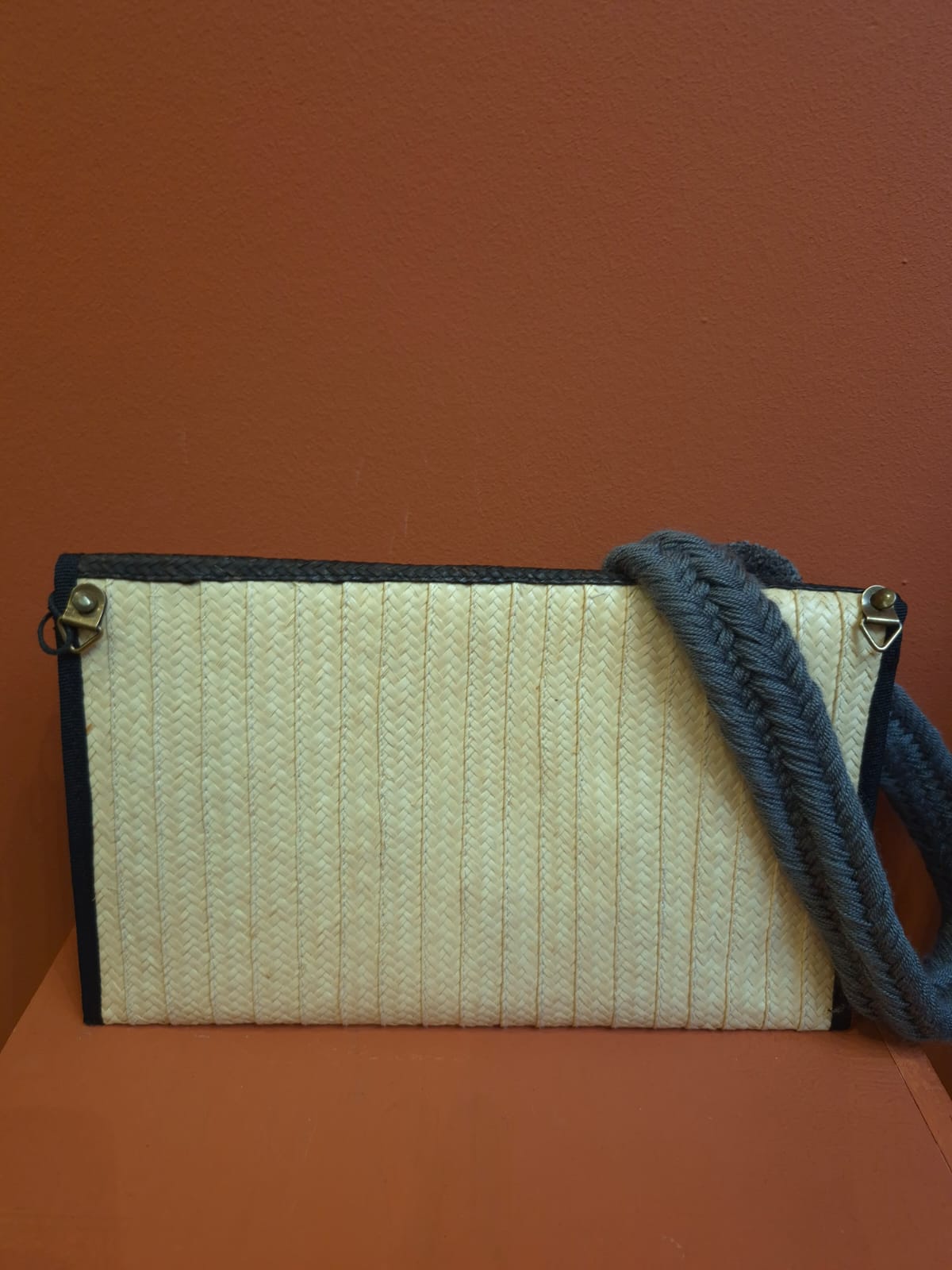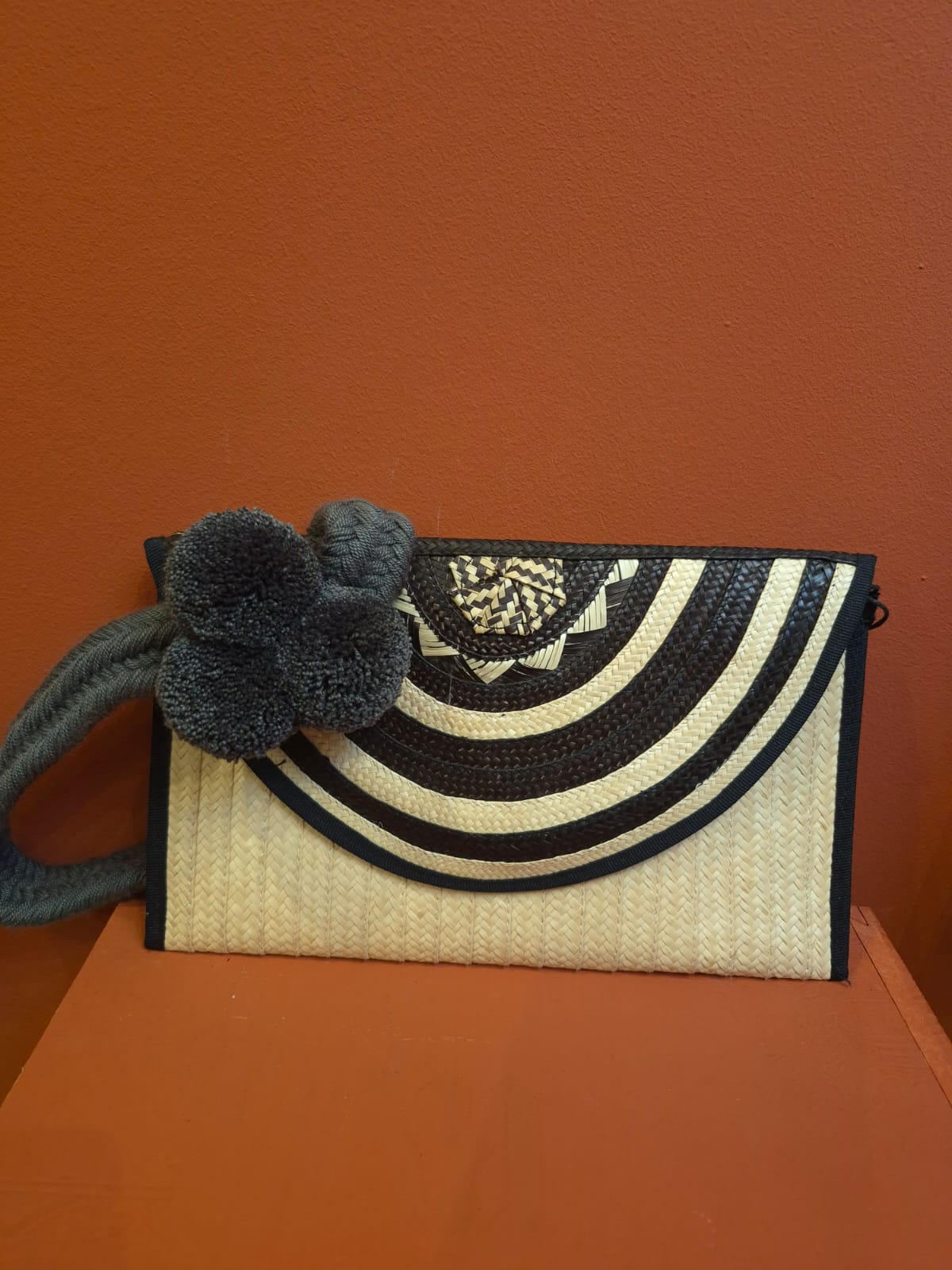 Clutch artesanal elaborado con fibras naturales y tejido a mano en blanco y negro.