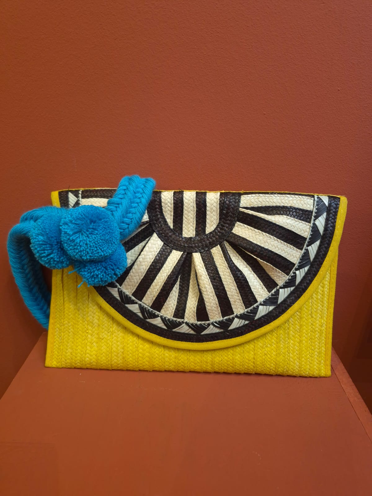 Clutch artesanal elaborado con fibras naturales y tejido a mano en blanco y negro.